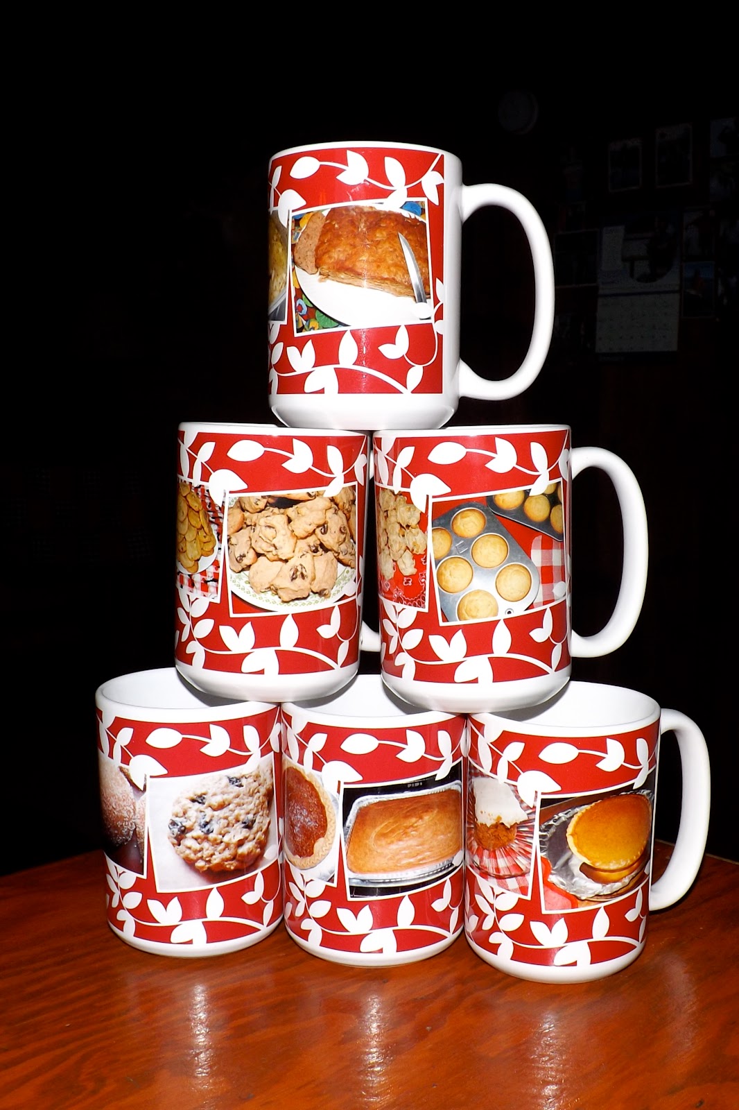 The first two mugs depicted my cooking and baking photos from the year before. The first one had three photos: applesauce, pecandy pie and persimmon pudding. The second one showed my ginger snaps, horse puckey fudge, and oatmeal raisin cookies.