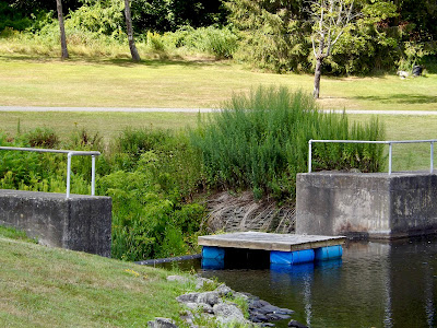I'm referring to the loose dock. Hope it stays where it is and won't wander around the corner and bang into mine! Not all homeowners are permanent and I don't know if it has been identified and the owner notified. It is a hazard. Perhaps one of the other residents will be able to tow it away soon. The good thing is that the water level is low and not flowing over the spillway and I don't think this traveler will blow over and down into the sparsely filled creek below. My rideabout today was not at all interesting but I plan to take another trip tomorrow. The sun felt good.