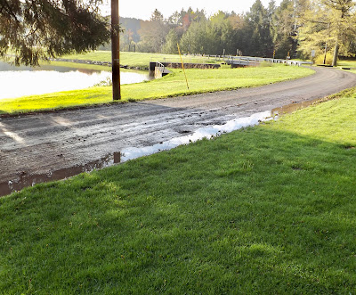You see, the cabin was built at the bottom of a slope of trees, without thoughts of what would happen if there was a lot of rain in just a day or two. One time it did flow into the cabin's back surrounding ditch and came into the back room and ran across the floor. Floor tiles were removed and never replaced since then!